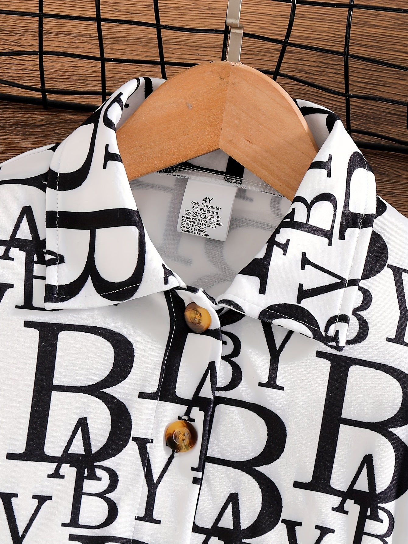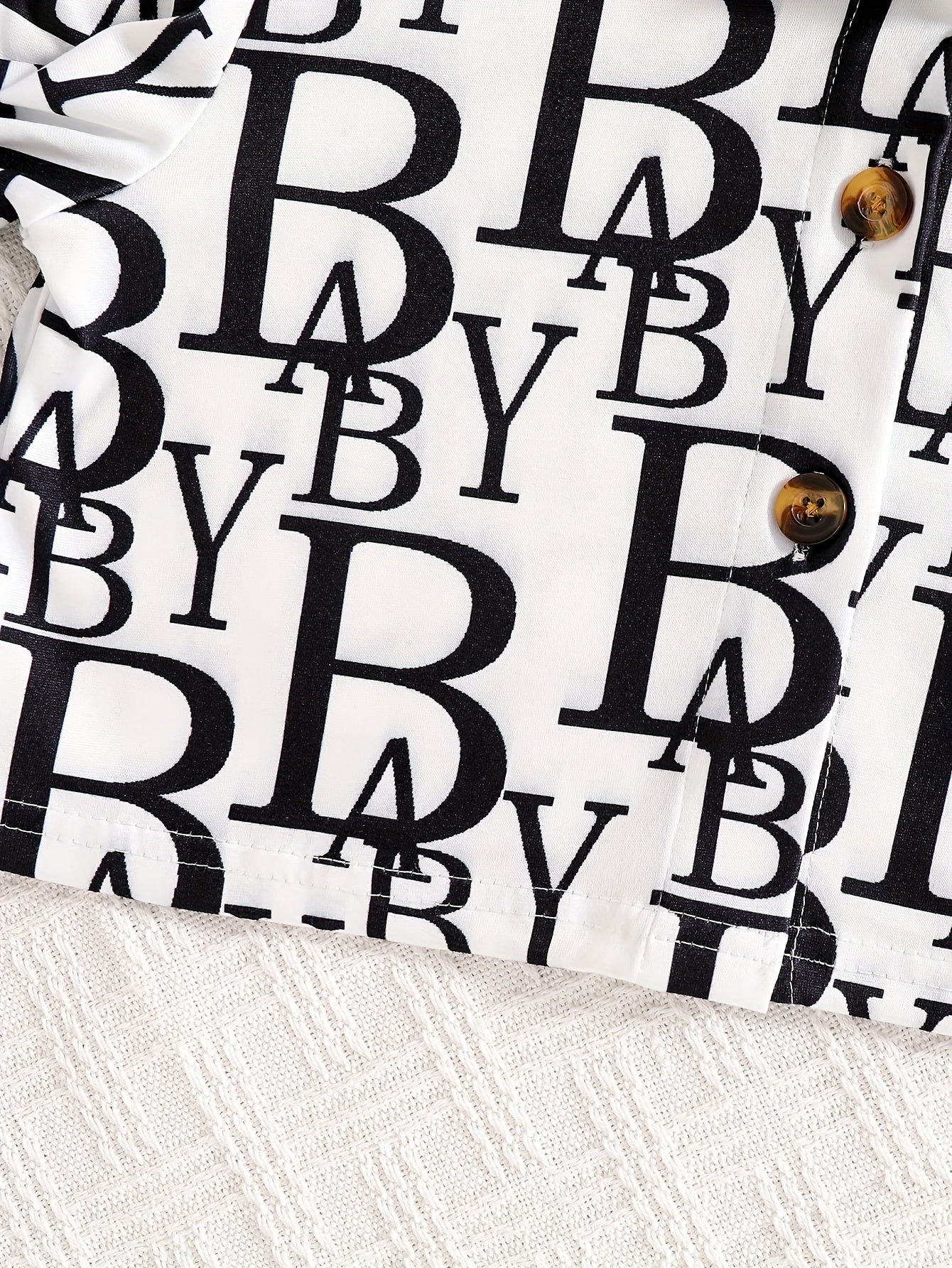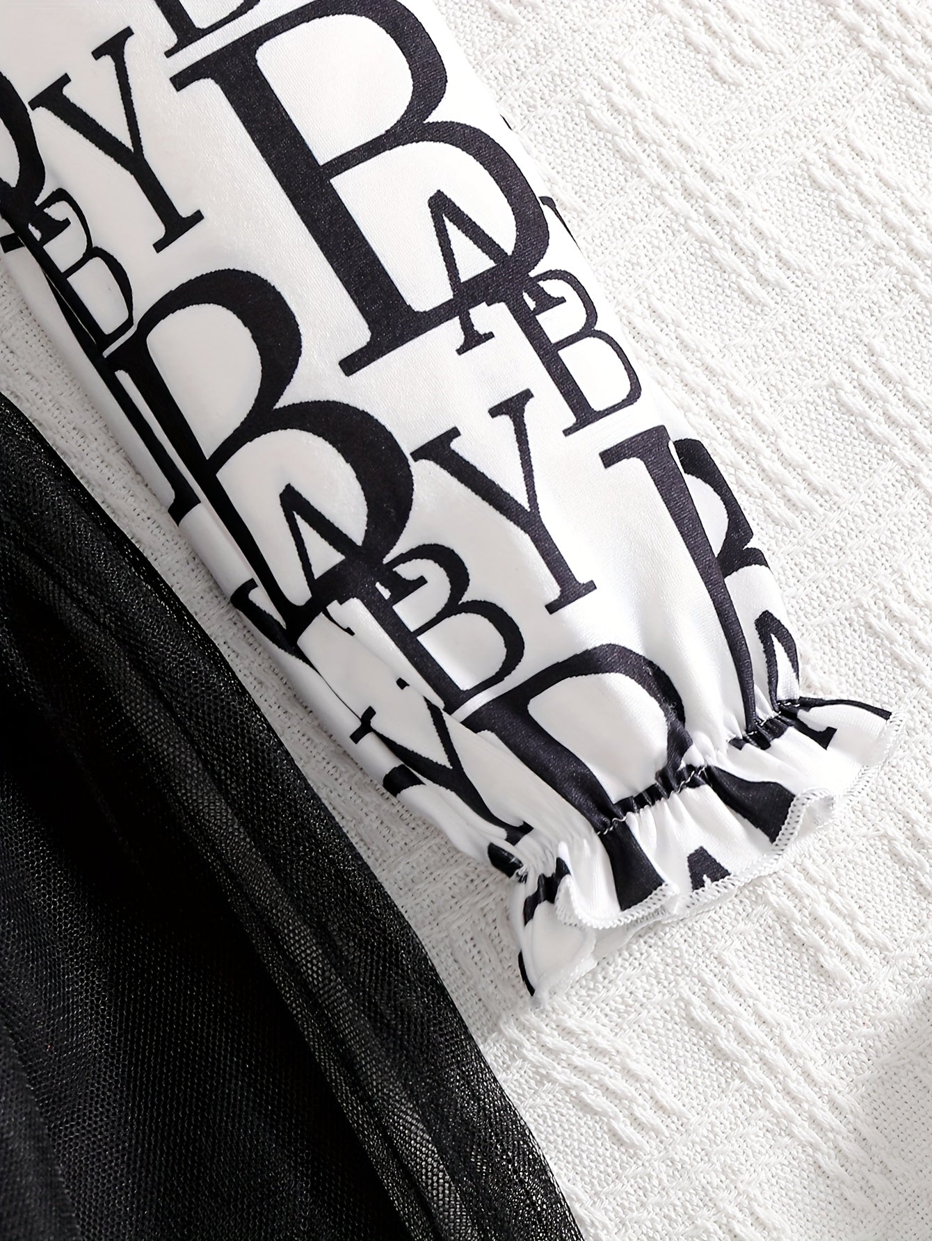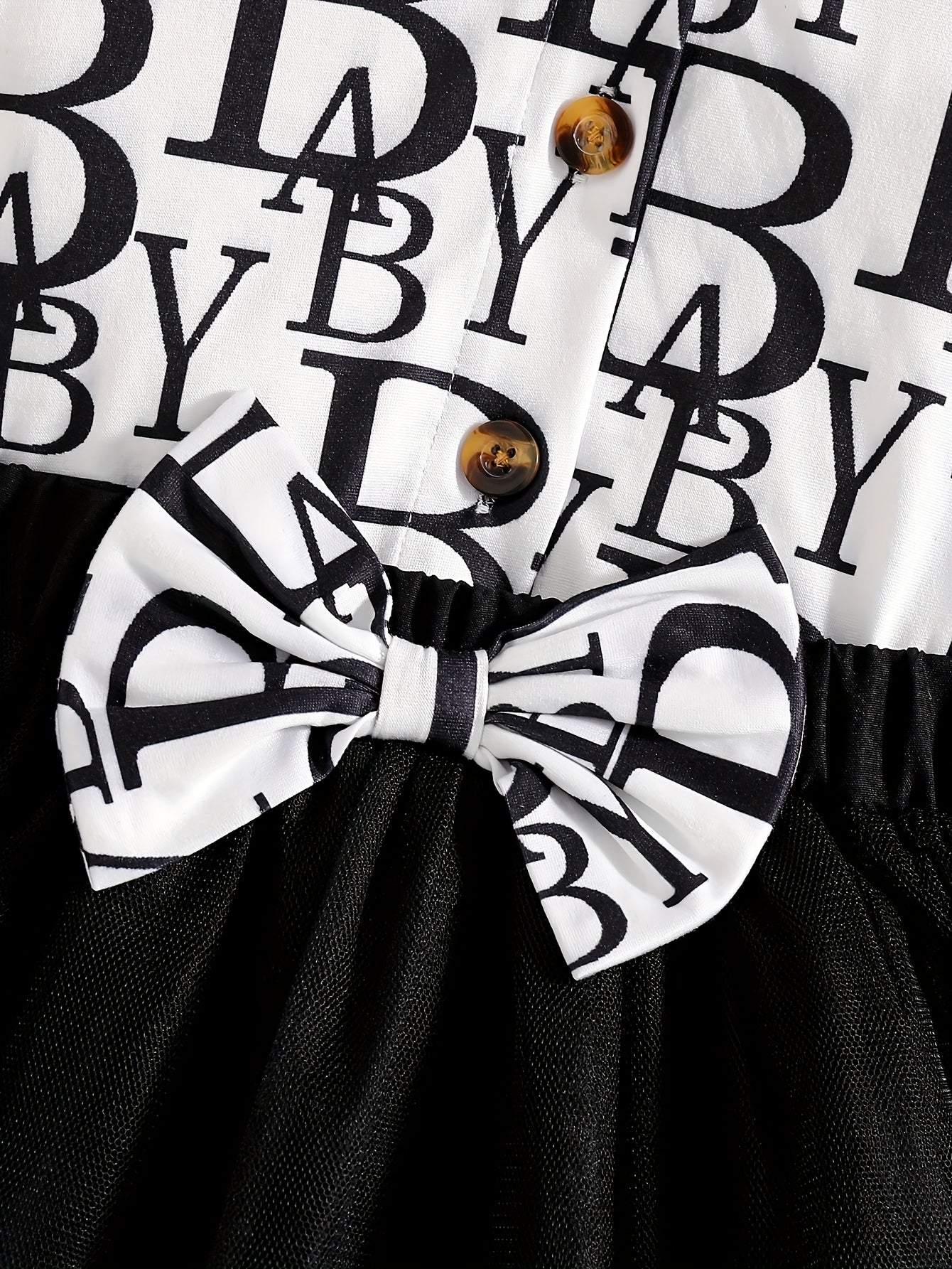 2pcs Set Girls' Trendy Long-Sleeve Shirt + Elastic Waist Mesh Skirt Spring/Autumn Fashion Street Style Letter Print Shirt with Bow Detail Short Dress Two-Piece Flounce Collar Button-Up Cardigan Puff Sleeve Princess Dress Soft