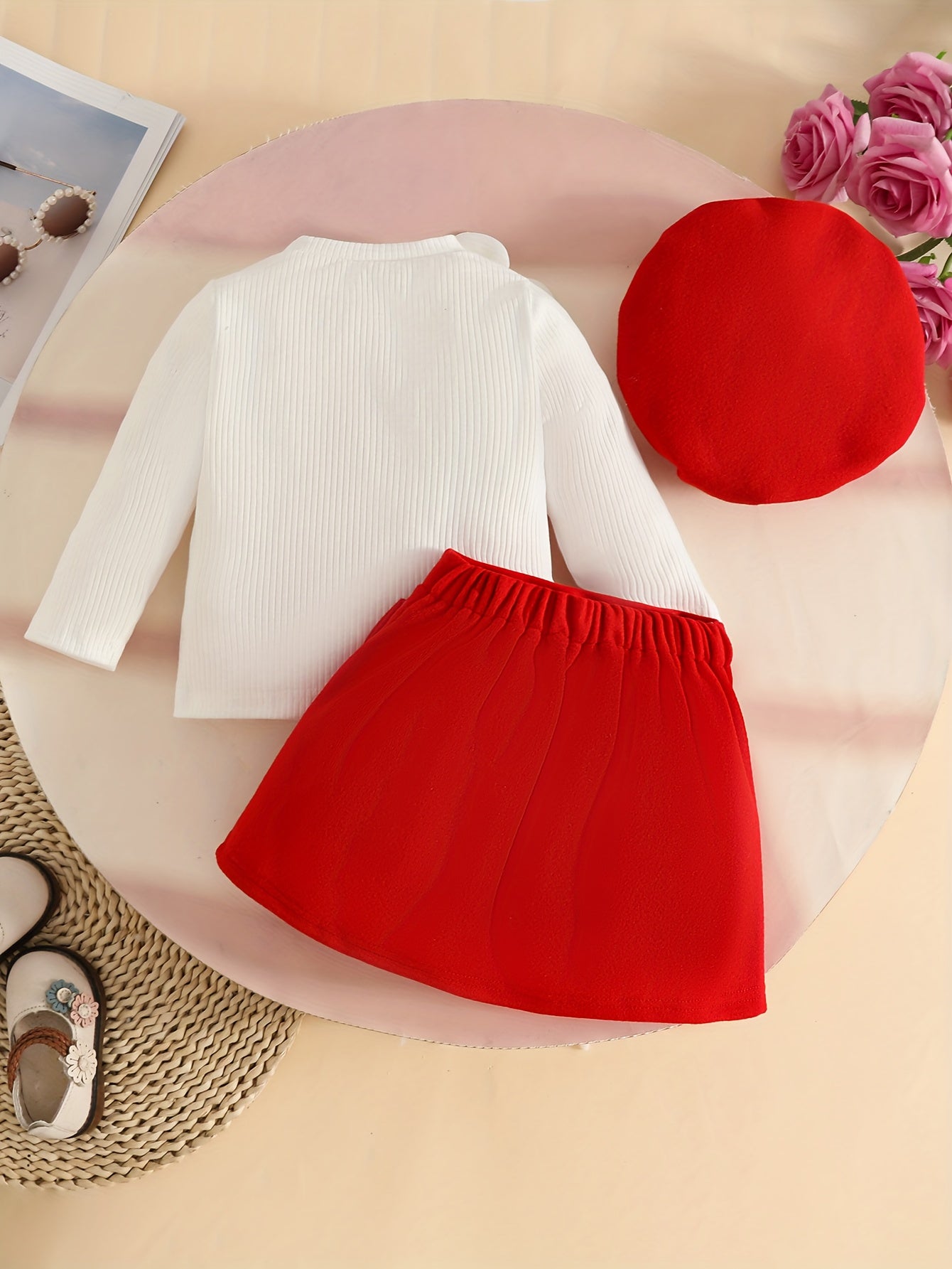 3pcs Girls' Elegant Tweed Outfit Set with Ruffled Sleeve Blouse, A-Line Skirt & Bow & Pearl-Adorned Hat - Soft Pink Winter Clothes for to 12m, Hand Washable Layered Dress for Everyday & Special Occasions, Semi- Round Neck Lon