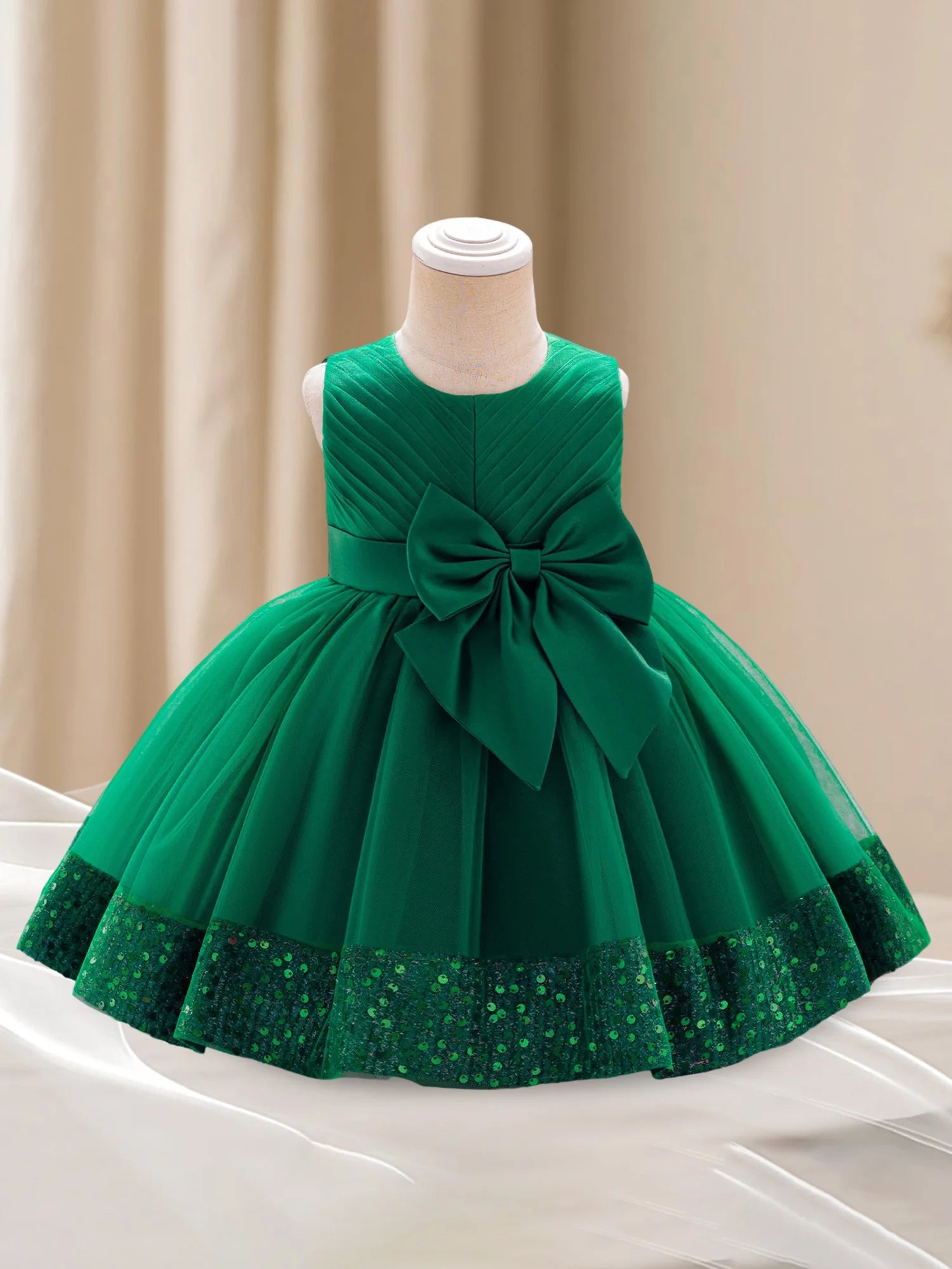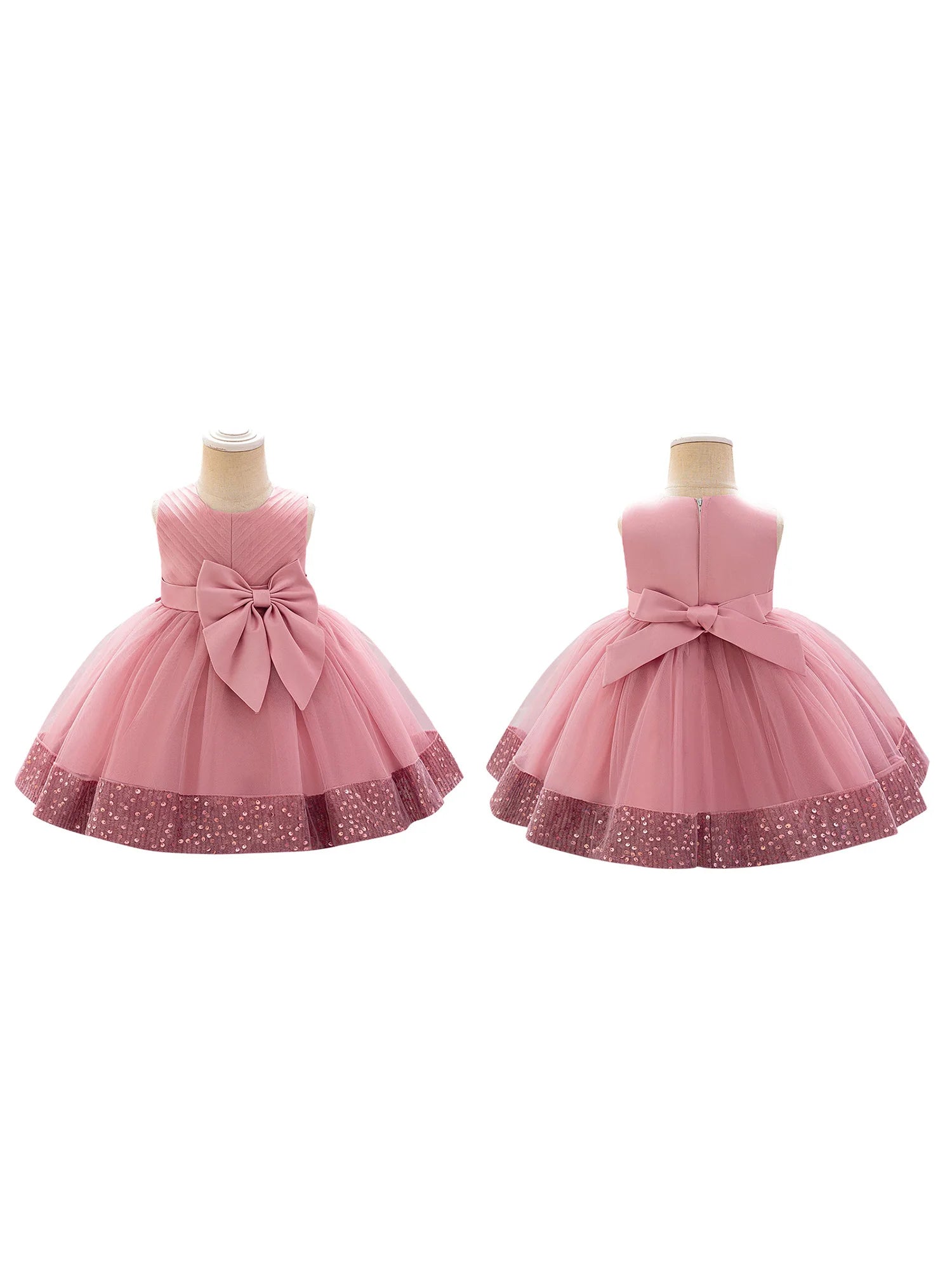 Girls Sleeveless Round Neck Sequins Hem Tulle Patchwork A-line Dress with Sparkling Embellishments and Bow Detail