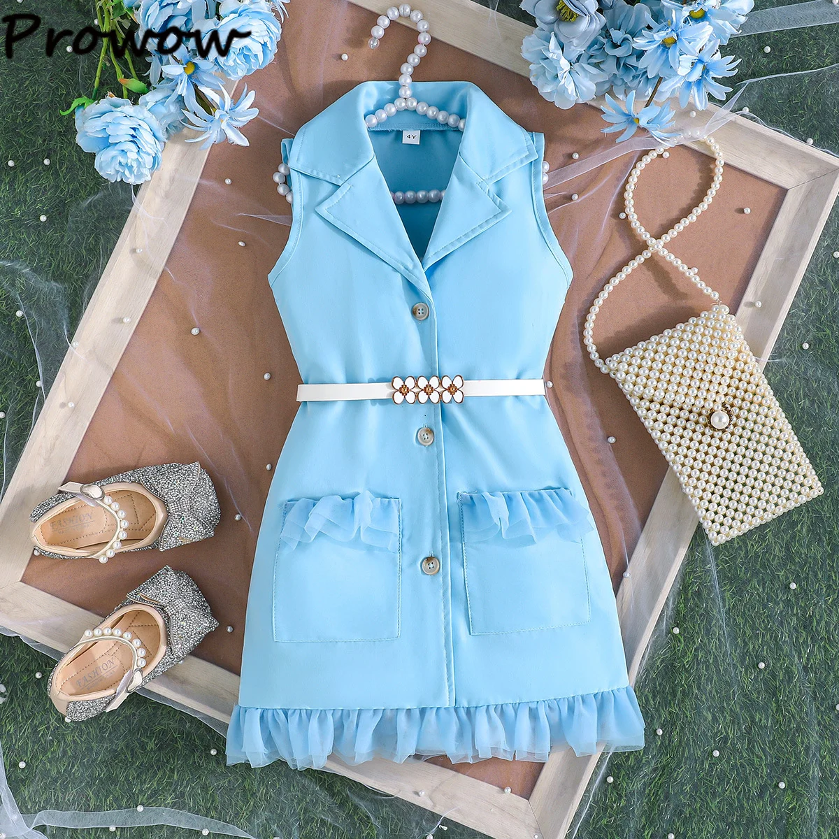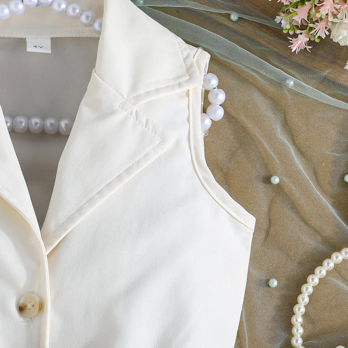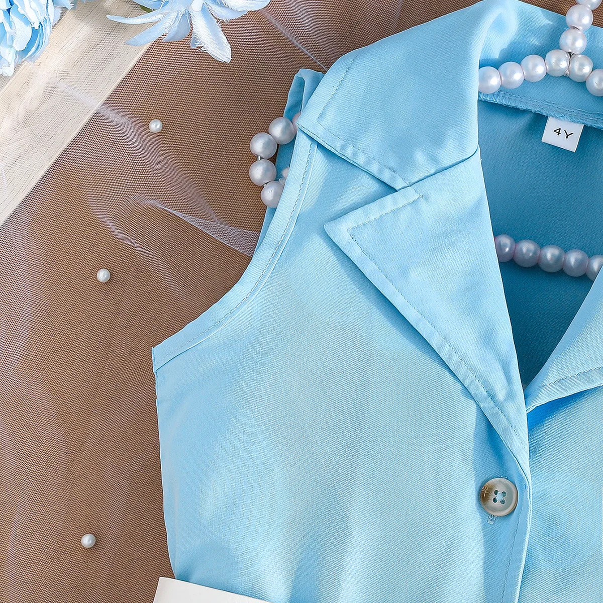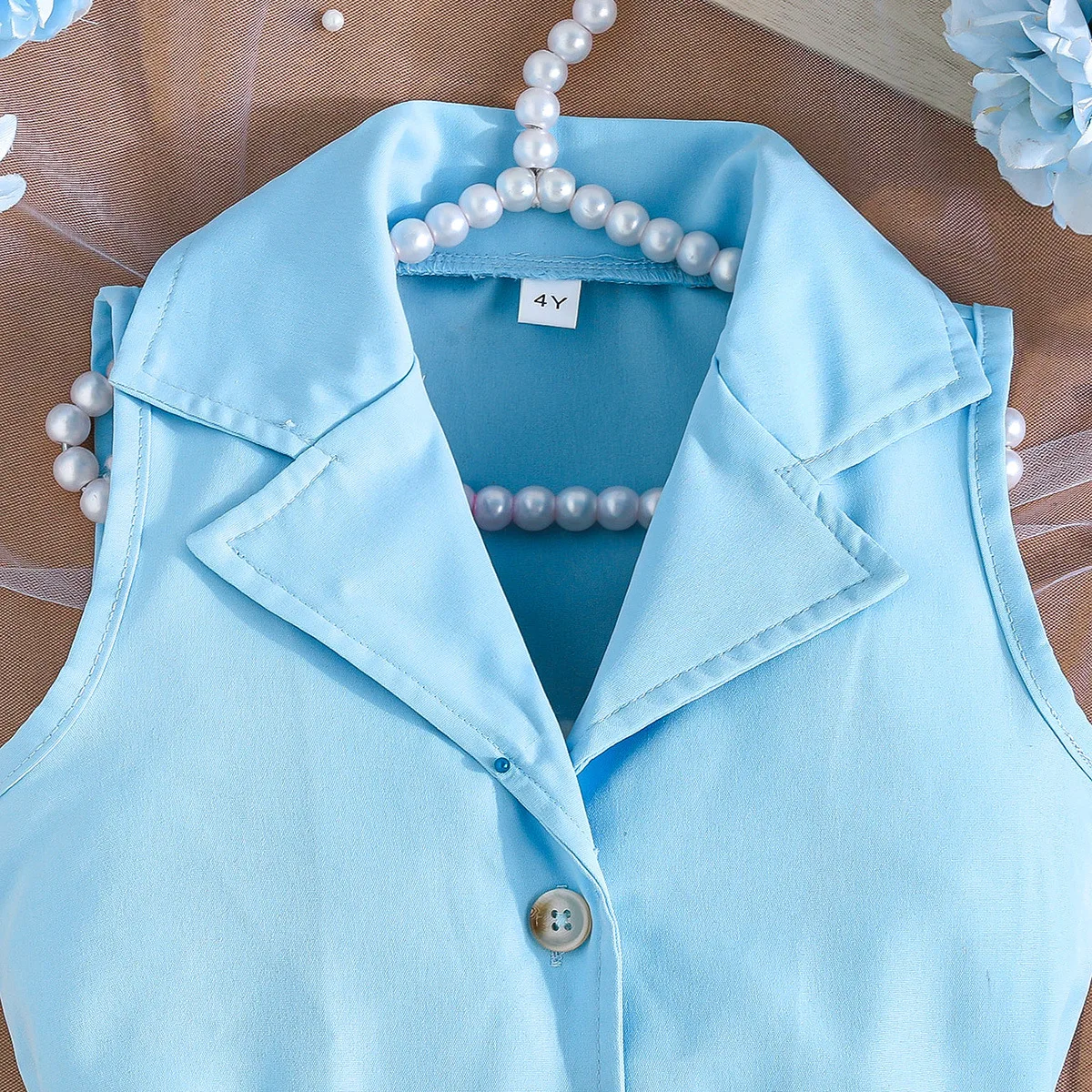 Prowow Girl's Blazer Dresses Sleeveless Lapel Fashion Lace Dress For Kids With Belt 2pcs Children Clothes 3 To 8 Years Old