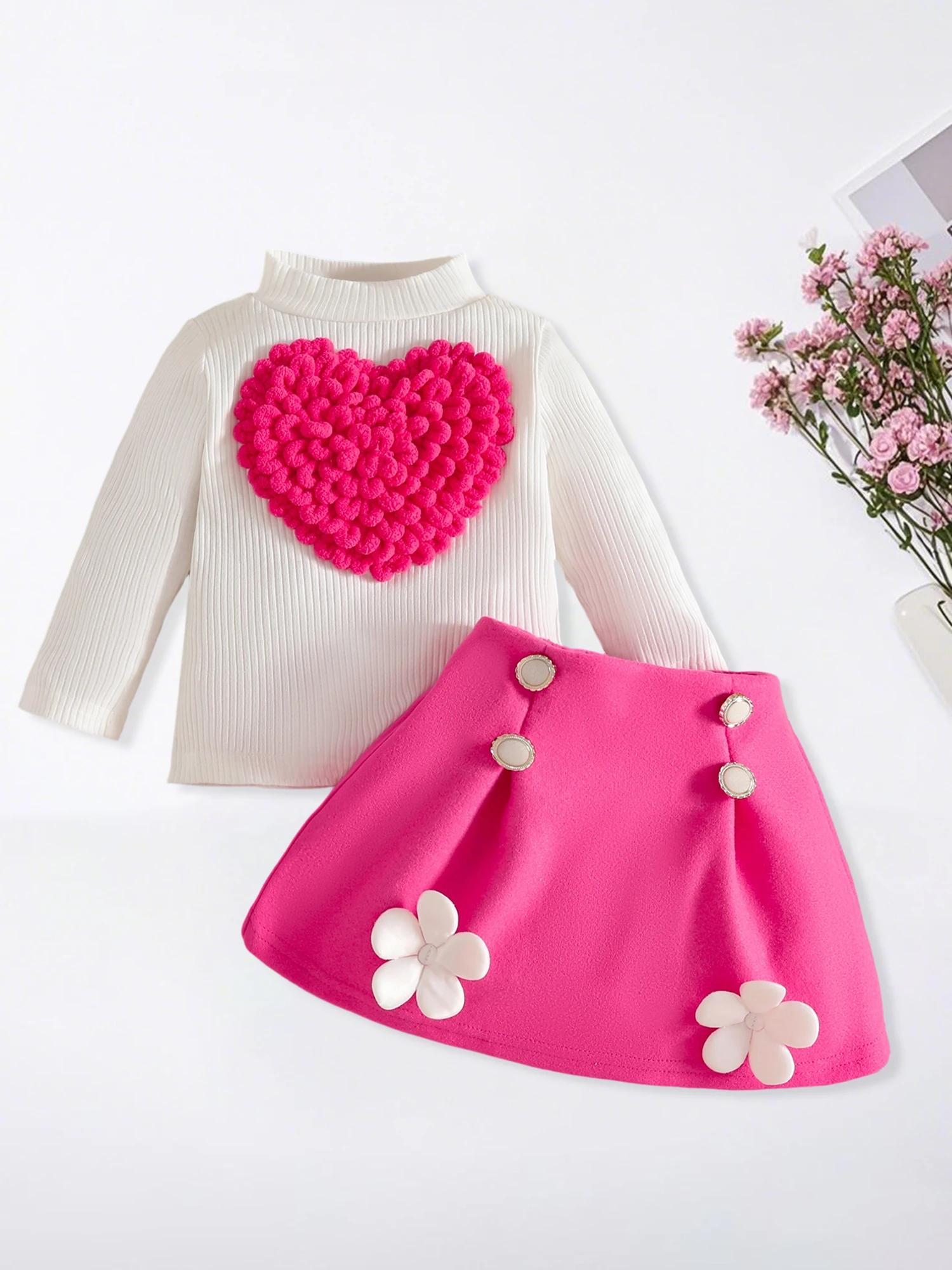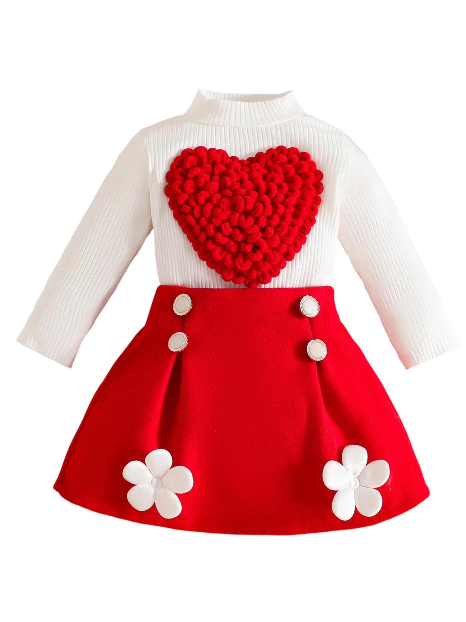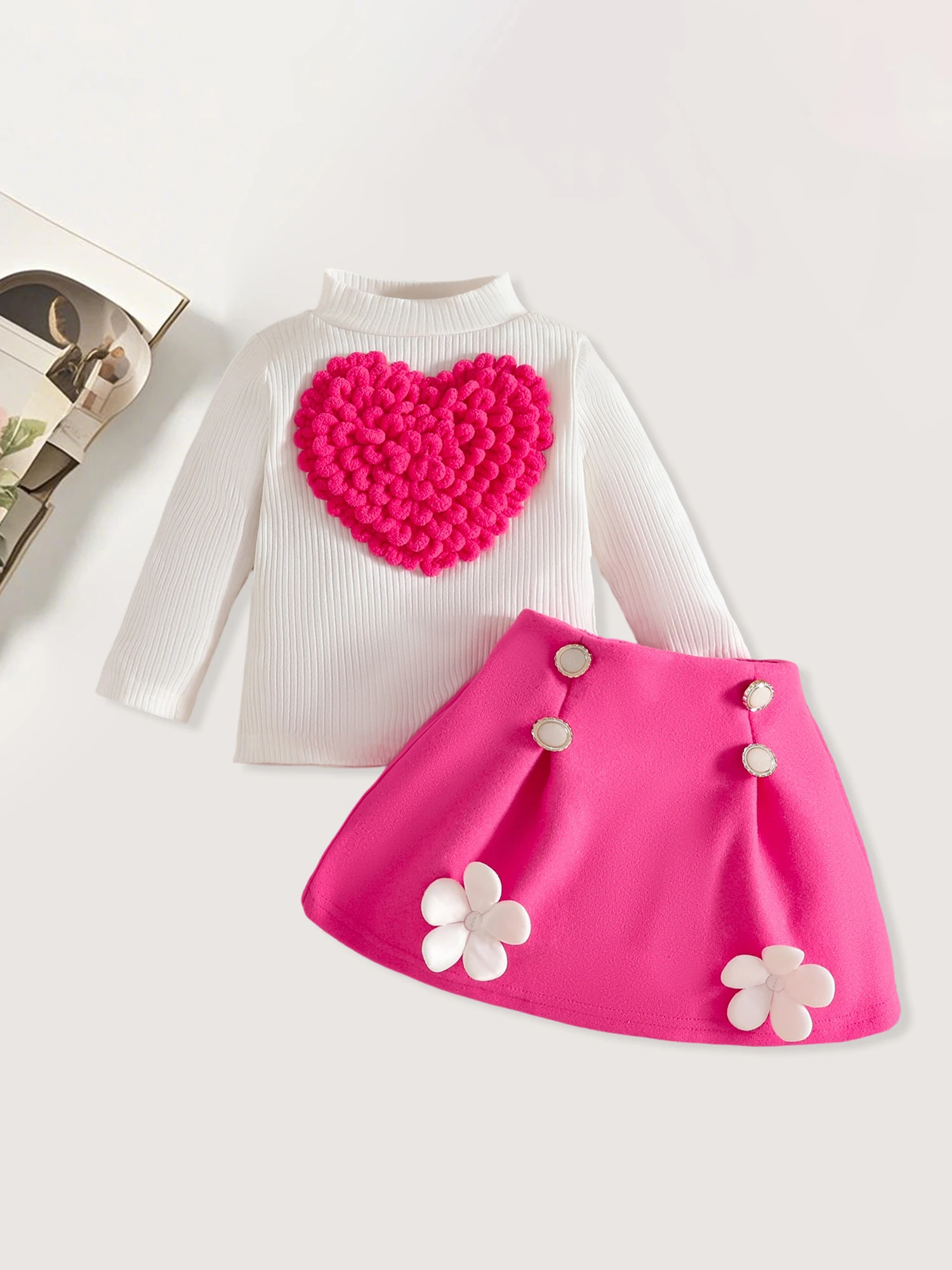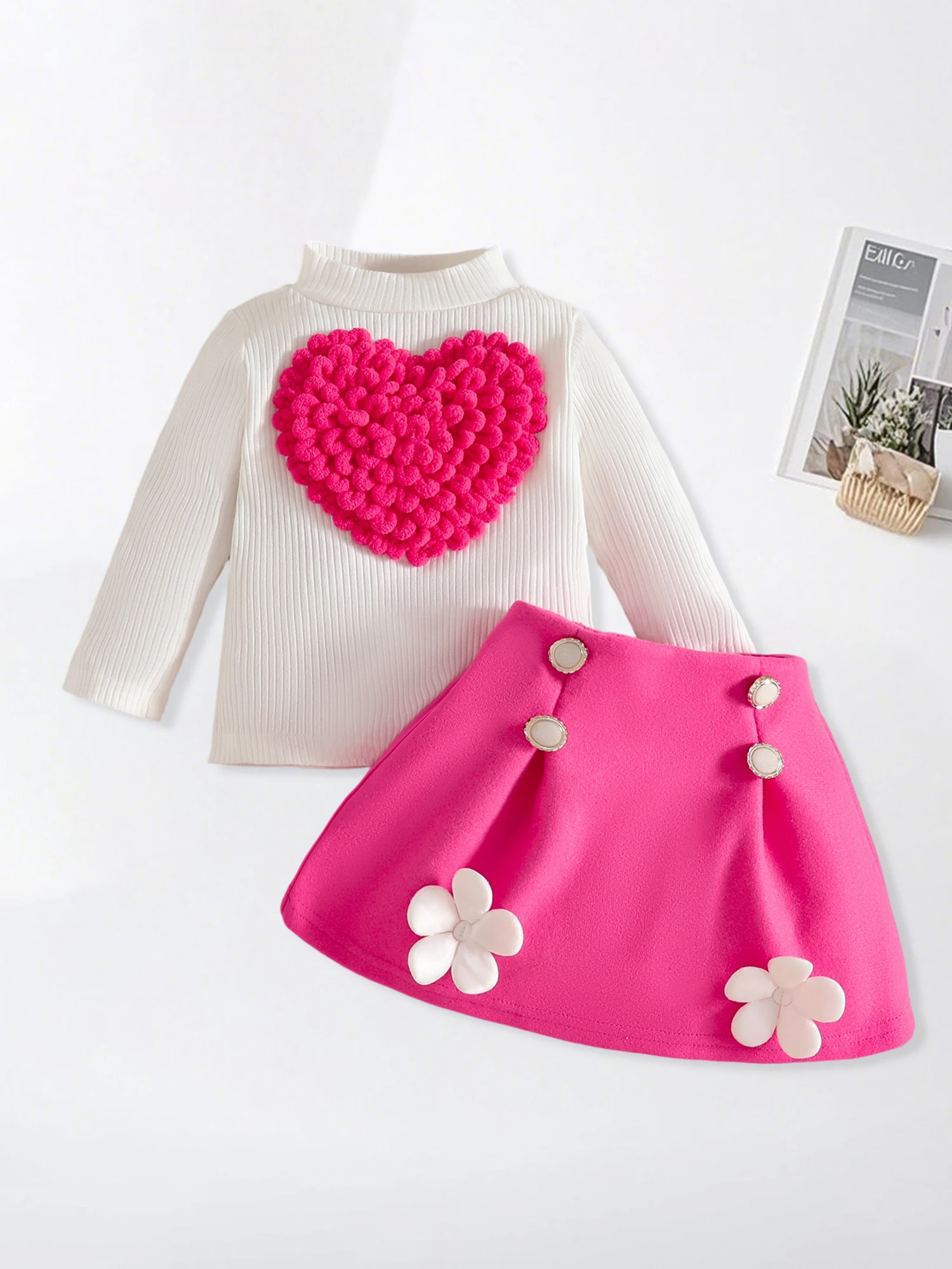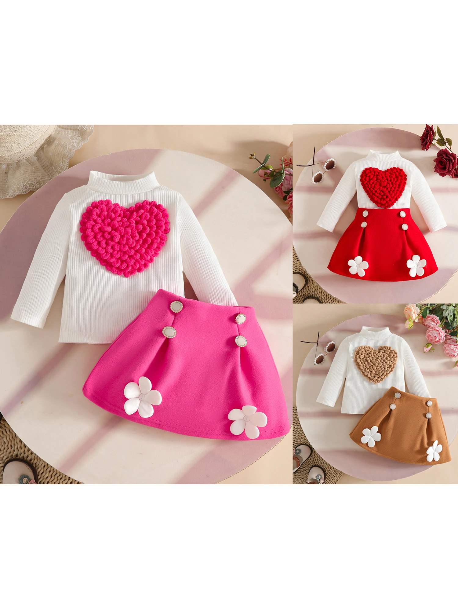 Toddler Girl Fall Outfit Heart Mock Neck Long Sleeve Tops with 3D Flower Mini A Line Skirt 2Pcs SetSize(cm)