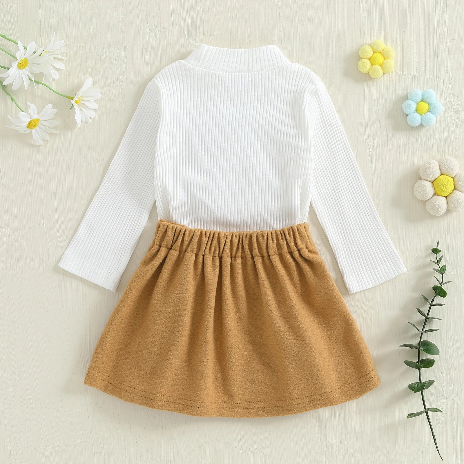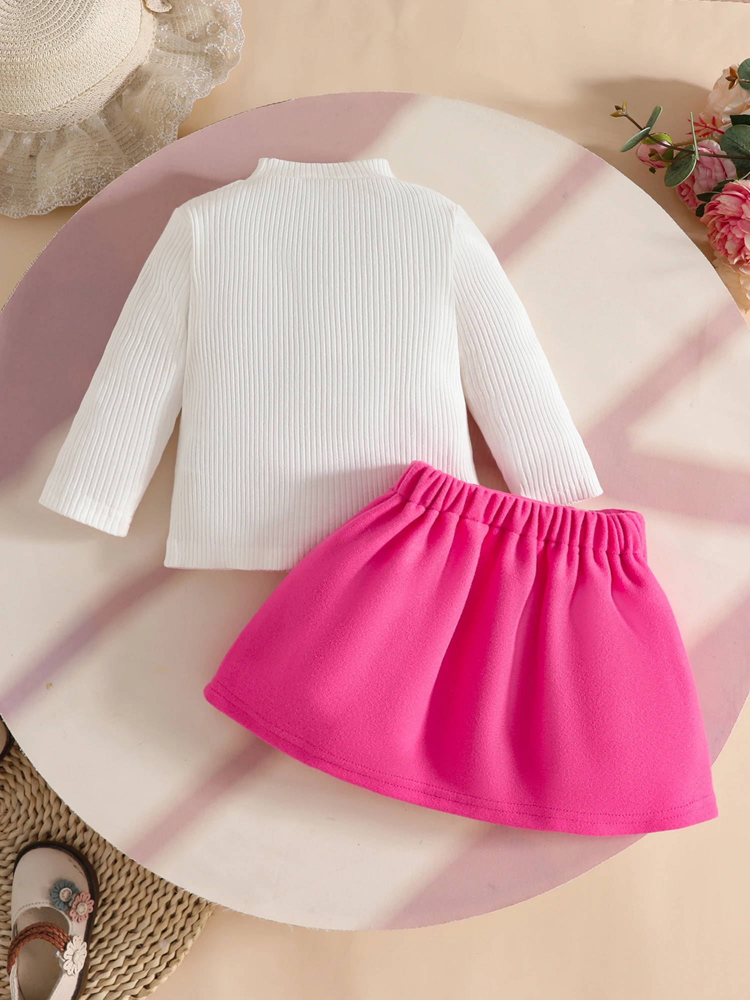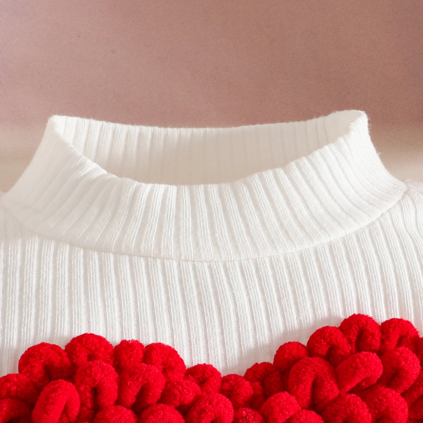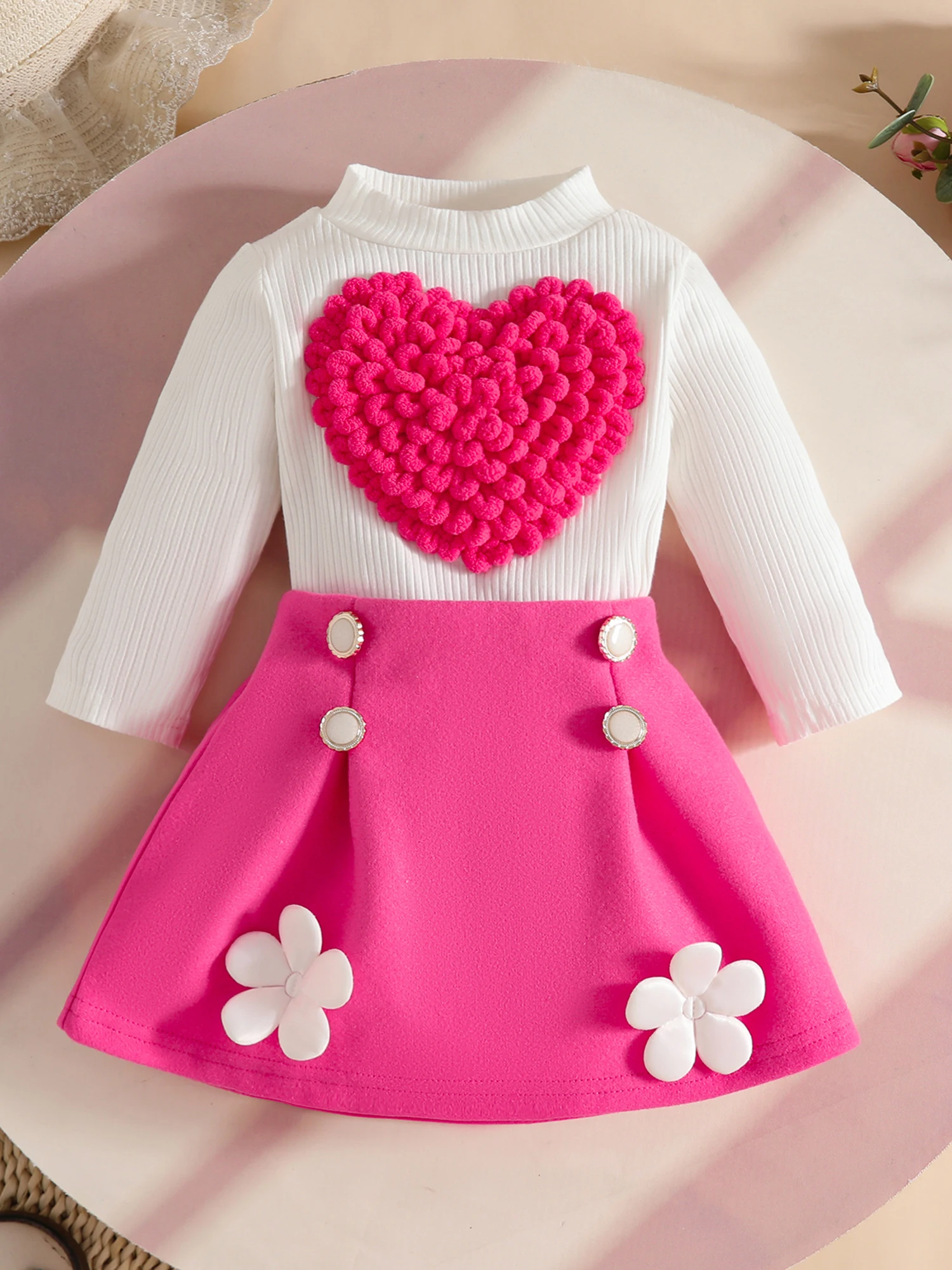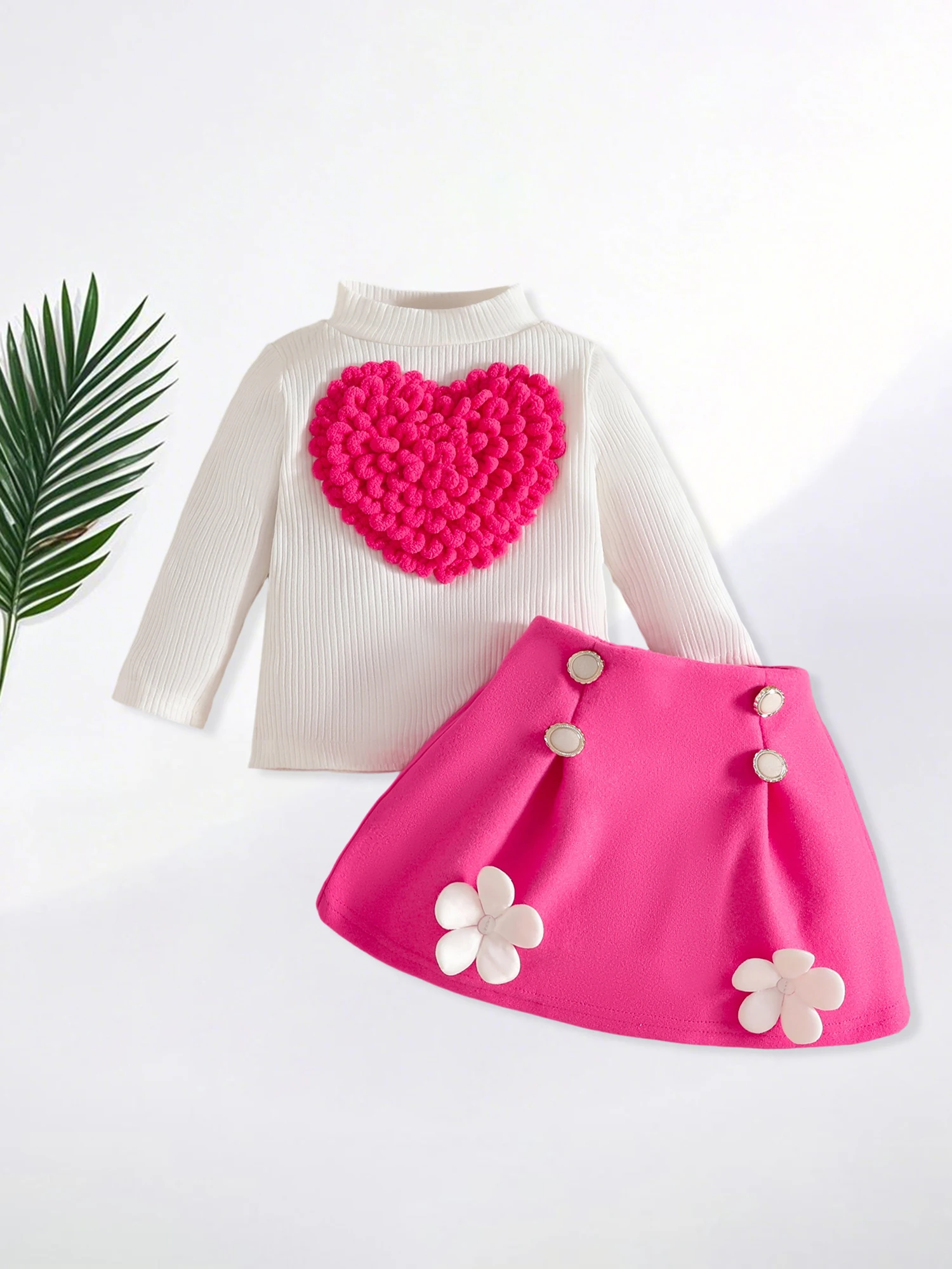 Toddler Girl Fall Outfit Heart Mock Neck Long Sleeve Tops with 3D Flower Mini A Line Skirt 2Pcs SetSize(cm)