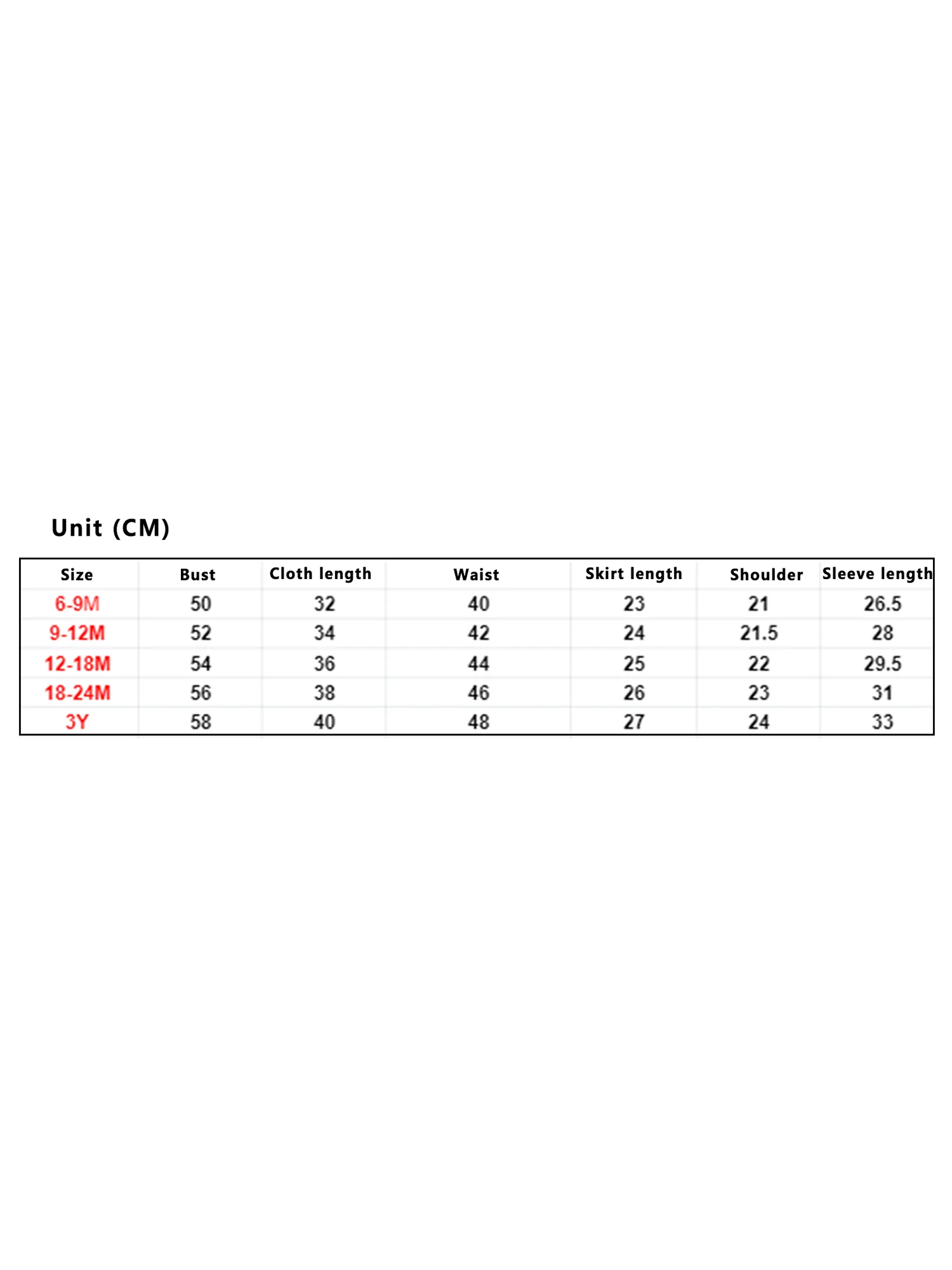 6-9M Tops Length: 12.60 Bust: 19.69 Sleeve: 10.43 Shoulder: 8.27 Waist: 15.75 Skirt length: 9.06 Advised Age: 6-9 Months